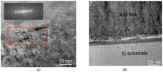 The images of the microstructure and crystal orientation of the AlN film were also obtained via HRTEM (Figure 6). AlN crystallites are oriented in the (002) plane perpendicular to the substrate surface, as expected. Additionally, the thin transition layer was found at the film–substrate interface. The sample thickness varies from 900–1000 nm, and this non-significant variation is due to the features of the sample preparation process.