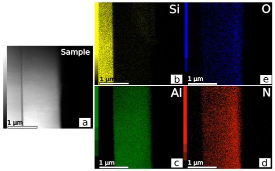 EDX maps of elements: (a) sample image in HAADF-STEM mode, (b) silicon, (c) aluminum, (d) nitrogen, (e) oxygen.