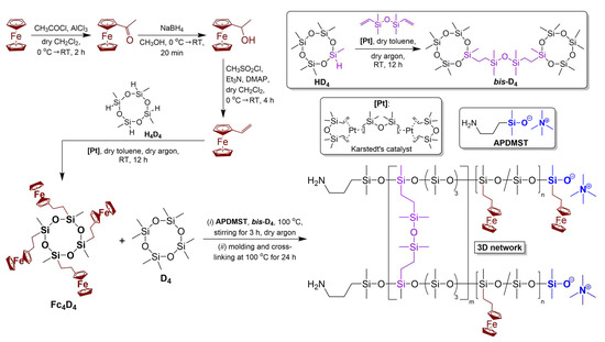 Hence, the general aim of the current study is to develop a method for obtaining protective ferrocenyl-containing silicone coatings with antistatic and redox properties due, on the one hand, to modification of the main polysiloxane chain by ferrocenyl groups and, on the other hand, to self-healing properties by introducing dynamic cross-links via the siloxane equilibrium mechanism. To achieve this goal, it is necessary to solve the following tasks: (i) synthesis of a new, previously unused bicyclic oligosiloxane cross-linking agent (bis-D4) containing a Si–O–Si linker and cyclic tetraferrocenyl-substituted 1,3,5,7-tetramethyltetrasiloxane (Fc4D4); (ii) preparation of self-healing ferrocenyl-containing silicone rubbers (FSRs) by a cross-linking reaction between cyclic octamethylcyclotetrasiloxane (D4), Fc4D4, and the cross-linking agent (bis-D4); (iii) selection of the optimal cross-linking degree and ferrocene content; and (vi) characterization of the obtained FSRs: determination of swelling parameters, evaluation of tensile and self-healing properties, redox activity, electrical conductivity, and thermal properties.