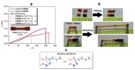 Stress–strain curves of the original and healed FSRs at a stretching speed of 40 mm∙min−1 (a), demonstration of self-healing properties for FSRs (b), and scheme of siloxane equilibrium (c).