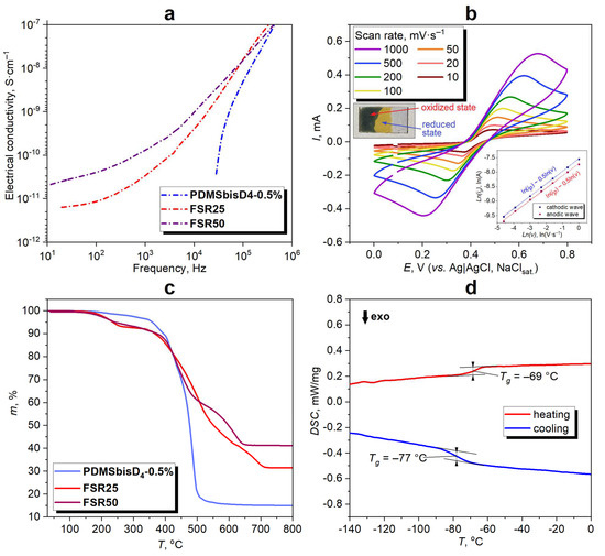 The frequency dependence of electrical conductivity of FSRs and model PDMSbisD4-0.5% at RT (a), CV curves of FSR25 film deposited on a GC electrode recorded at various potential sweep rates in 0.1 M LiClO4 H2O–CH3CN (4:1, V/V) solution with dependence of peak current ip on the potential sweep rate v in bilogarithmic coordinates and demonstration of EC (FSR25 deposited on ITO glass shows EC as in the case of the previously reported FSRs [57]) (b), TG curves of FSRs and model PDMSbisD4-0.5% from 25 to 800 °C (c), and DSC curves for FSR25 from −140 to 0 °C (d).