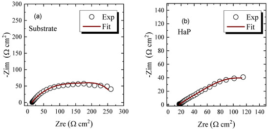 The electrochemical impedance spectroscopy (EIS) is widely known as an effective technique applied to study the corrosion behavior of the used materials in the interface between the coatings and the electrolytes. Based on EIS, the corrosion resistance property of the elaborated coatings (e.g., the behavior of the dual-layer capacitance and charge transfer resistance) was determined. In Figure 8, the Nyquist plots of the impedance diagrams of both the Ti-6Al-4V substrate and the HaP + TiO2 coatings are presented. To simulate the experimental data, the EIS results were fitted through an equivalent circuit using the ZSimpWin software. As shown in Figure 9, the equivalent circuit model consists of the following elements: (solution resistance), (coating resistance), (charge transfer resistance at the electrode–electrolyte interface), (double-layer capacitance) and (interfacial capacitance). The different value parameters fitting the circuit model are detailed in Table 4.