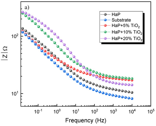 The Bode diagrams of impedance and the phase for different coatings in the SBF solution are presented in Figure 12. The Bode plot generally shows that higher values of |Z| at lower frequencies indicate higher levels of corrosion resistance. Based on the result presented in Figure 12a, it can be inferred that the HaP + 20% TiO2 coating has the highest corrosion resistance due to its higher Z modulus at low frequencies. The lowest Z modulus is related to the uncoated substrate. The electrochemical response of the HaP + 20% TiO2 coating, as shown by the slope in the data, suggests that its electric double-layer capacitance is mostly capacitive. This observation implies that the coating has the potential to effectively minimize the corrosion rate of Ti-6Al-4V when exposed to SBF [41]. According to the Bode plots of the phase exposed in Figure 12b, a capacitive behavior results from the maximum phase angle occurring at low frequencies. At high frequencies, the impedance is not affected by frequency, while the phase angle approaches 0°, indicating a resistive behavior that corresponds to the resistance of the SBF solution between the working and reference electrodes. Conversely, in the low-frequency region, the HaP + 20% TiO2 coating demonstrates a phase angle approaching −35°. This value indicates the capacitive behavior of the electrode–electrolyte interface.