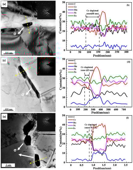 The line EDS profiles of the element concentrations were collected across the sigma/austenite interface, as seen in Figure 2b,d,f. The sigma precipitates consisted of Cr, Fe, Ni, and Mo. The contents of Cr and Mo were higher than that in the matrix, while the contents of Fe and Ni were lower. The Cr-depleted zone was observed on both sides of the sigma precipitates. The width of the Cr-depleted zones was 63–78 nm, and it did not clearly expand with rising aging temperature (Figure 2b,d,f). Meanwhile, the minimum Cr content increased with the rising aging temperature. The minimum Cr content in the Cr-depleted zone was 16, 19, and 20 wt% after aging at 700, 800, and 900 °C, respectively.