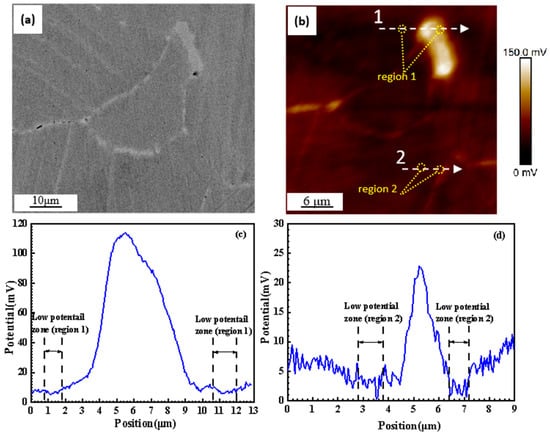 The formation of Cr-rich precipitates can also induce a potential difference between the precipitates and the matrix. Stickler and Vinckier [11,12] suggested that the potential of Cr-rich precipitates is more noble than the matrix. Consequently, the matrix is corroded electrochemically, and the grain boundaries are attacked. This mechanism is the so-called electrochemical theory. In recent years, by Kelvin probe force microscopy (SKPFM), the Volta potential around grain boundaries has been mapped, and the findings have confirmed this theory [13,14,15,16,17]. For example, Namurata reported that the Volta potential of sigma precipitates is 25 mV higher than that of the ferrite matrix [15]. Krishnan discovered a 260 mV potential difference between M23C6 and the matrix [14].