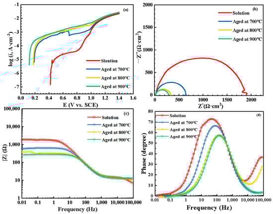 Electrochemical test results of UNS N8028 heat-treated samples in 6% FeCl3 solution at 50 °C. (a) the anodic polarization curves; (b) the Nyquist plots; (c) the Bode logarithmic amplitude-frequency characteristic curve; and (d) the Bode logarithmic phase–frequency characteristic curve.