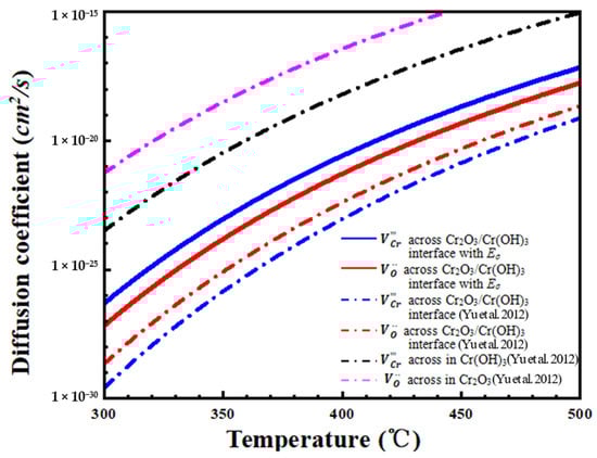 Self-diffusion coefficients of and across the Cr2O3/Cr(OH)3 interface under the anodic electric field () formed by the potential difference ( = 0.102 mV) between the sigma phase and low-potential area [25].