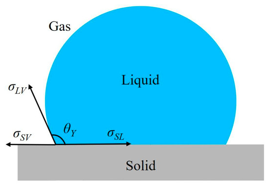 where is the contact angle, and , and are the interfacial tensions of the solid–gas phase, solid–liquid phase, and liquid–gas phase, respectively, as shown in Figure 1.