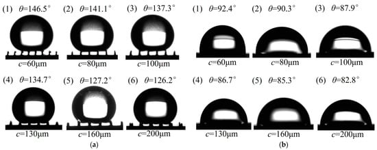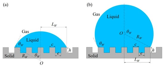 The non-composite state model makes the hydrophilic surface more hydrophilic and the hydrophobic surface more hydrophobic [37]. Therefore, the hydrophilic surface and the hydrophobic surface will present the two cases shown in Figure 2.