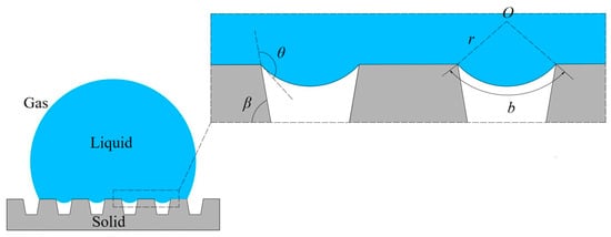 Water droplets in contact with solids are subjected to additional pressures caused by downward hydrostatic pressure and additional pressure caused by contact line tension [40]. According to the phenomenon of capillary action, the actual liquid–gas contact line between the water droplet and the microstructure is not straight. There is a certain angle at the contact position, which is equal to the intrinsic contact angle of the solid, as shown in Figure 3.