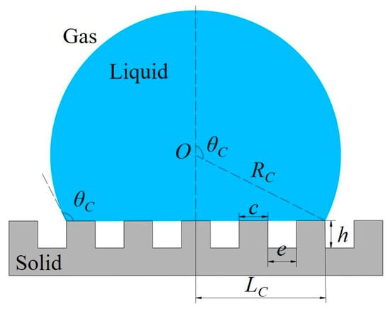 According to Figure 4, LC is the distance from the edge of the three-phase contact line to the middle of the contact line and θC is the composite state contact angle. Therefore, the number of convex platforms can be expressed as Equation (19):