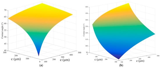 The model established by Equations (14) and (25) was numerically simulated with MATLAB (Matlab R2016b, 2016, MathWorks, Natick, MA, USA) and the three-dimensional surface diagram of the relationship between contact angle and micro-structural dimension parameters was obtained, as shown in Figure 5. It can be seen that the contact angles of the non-composite state and the composite state are increasing functions of the eigenvalue e, but the non-composite state contact angle increases and the composite contact angle state decreases when the eigenvalue c increases. In particular, the composite state contact angle increases relatively greatly when the eigenvalue c decreases.