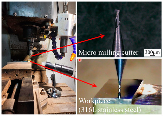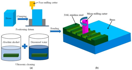 316 L stainless steel sheets (Shanghai Luhao Metal Group, Shanghai, China) with a dimension of 16 mm × 5 mm × 1 mm were selected for experimental validation of the prediction models. 316 L stainless steel is widely used in the biomedical field due to its excellent corrosion resistance and biocompatibility. Before machining, the surface of the material was polished to ensure machining accuracy. It is worth mentioning that due to the small thickness of the sample, it cannot be directly clamped onto the micro-milling machine. Therefore, we proposed to use brass with the dimension of 40 mm × 16 mm × 16 mm as the substrate. Firstly, the face milling cutter with a diameter of 4 mm was used to roughen its surface to form a positioning datum. Then, the 316L stainless steel polished sheets were ultrasonically cleaned with absolute alcohol and deionized water for 5 min to remove impurities and oil stains on the surface, and the cleaned samples were bonded to the positioning datum with 502 glue. After completing the abovementioned preparation work, a micro milling cutter was used to process the microstructure on the surface of the samples. The preparation process of the microstructure is shown in Figure 6.