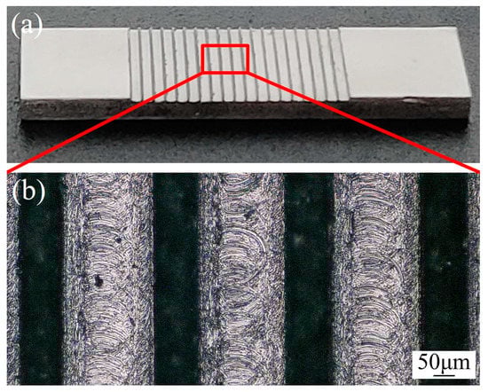 Some strategies for preparing hydrophobic surfaces have been proposed, including chemical methods [20,21,22] and micromachining methods [23,24,25]. Chemically, Wei et al. [26] combined hydrochloric acid etching with stearic acid modification to shape dense hydrophobic microstructures on the surface of a magnesium alloy. Wang et al. [27] constructed water-repellent composite coatings on a variety of substrates, which was attributed to the electrodeposition-polymer composite technology they developed. Mokhtari et al. [28] reported a new method combining anodic oxidation and stearic acid modification to construct microstructures on aluminum alloys and obtained hydrophobic surfaces at the cathode. However, the shape and geometry of the microstructures generated by chemical methods were random, and the wettability of the surface could not be accurately regulated. In addition, these processes usually involve complex cleaning and coating steps, as well as the use of dangerous chemical reagents and gas masks [20,27].