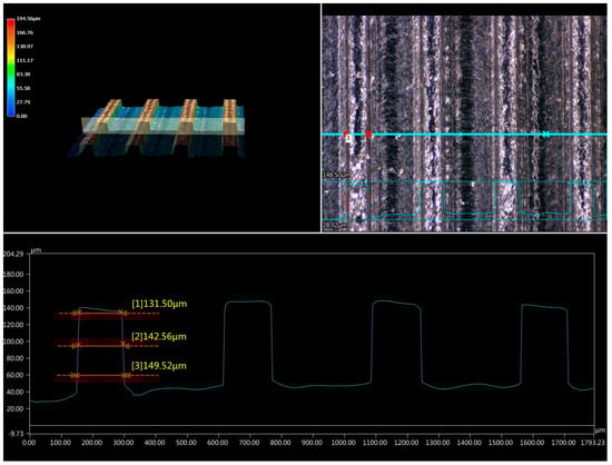 Figure 9 is the outline dimension of rectangular microgrooves on the surface of sample 4 measured by the ultra-depth 3D microscope. It can be seen that the height of the convex is about 100~110 μm. This is because the tool fed downward while rotating with the spindle in the process of tool setting. Then, the tool setting process ended when the chip appeared on the surface of the sample for the first time. Note that the surface of the sample generated a certain depth when the chip was formed so the height of convex after processing was bound to be greater than the preset value. In addition, three positions of the same convex platform were measured from bottom to top, and the values were 149.52 μm, 142.56 μm, and 131.5 μm, respectively. Thus, the width of the convex platform decreased from bottom to top, which also led to increases in the corresponding spacing width. This is mainly due to the small diameter of the cutter, the large overhang of the cutter, and the chatter of the machine tool that caused the micro milling cutter to shake, and the upper part of the convex had a slight bending to both sides, leading to little stiffness [42]. It was calculated that the influence of the slight bending of the convex platform on the contact angle was only within 2°, which is almost negligible.