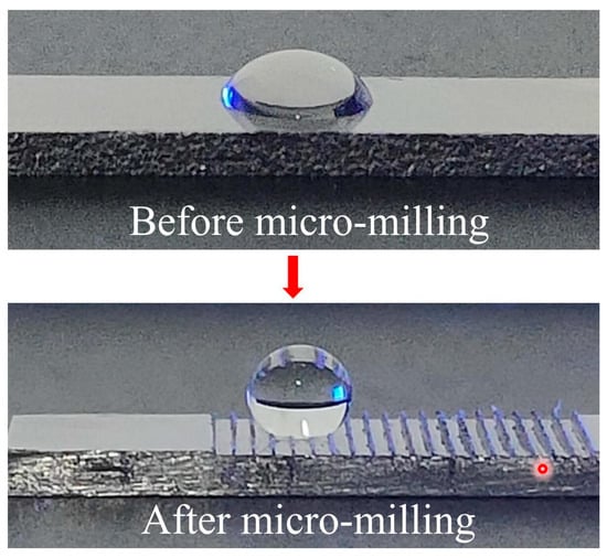 For micromachining methods, Volpe et al. [29] mapped square, circular, and triangular groove lattice microstructures based on a femtosecond laser. Chen et al. [30] constructed semicircular groove microstructures on the surface of SiCp/Al using WEDM and obtained controllable wear-resistant hydrophobic surfaces. Although both methods can generate some regular micro-features, the chemical composition and properties of the surface are easily changed due to the ablation of the substrate [23]. In addition, nanosecond laser will produce a high heat effect due to the low processing throughput, and WEDM is prone to generating irregular recast melting layers [30], which results in the formation of multimodal rough structures [31]. It is worth noting that with the decrease in machine tool runout and milling cutter diameter, it has become a reality to construct surface microstructures using micro-milling technology [32]. It is easier for micro-milling to achieve high-precision automatic control and obtain repetitive micro-features with large periods and depths, which provides favorable technical support for exploring the relationship between contact angle and micro-structural dimension.