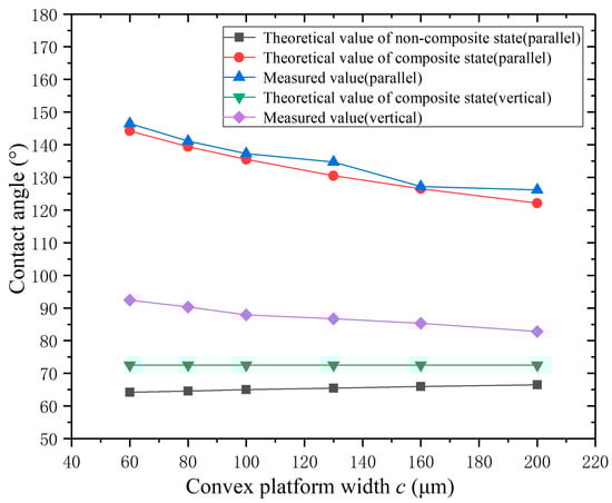To verify the reliability of the prediction models, the theoretical contact angle values under different convex platform widths are listed in Table 2 together with the experimental measurement values. Figure 13 shows the curve drawn based on the data in Table 2.