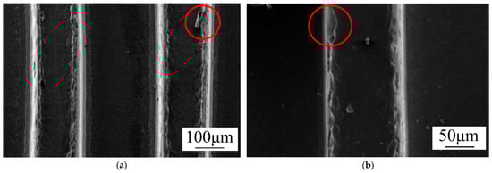 It is also found from Figure 13 that the variation trend of the theoretical contact angles of the composite state is consistent with the measured contact angles and the values are in good agreement with those in the parallel observation direction. The accuracy scope of the prediction model is 96.8%~99.4%. Although the measured contact angles are always slightly larger than the theoretical contact angles, the maximum difference between them is only 4.2°, which comes from the surface of sample 4. The main reason for this difference is that, although the cutting parameters had been optimized before the preparation of the microstructure, there were two cutting methods of down-milling and up-milling on both sides of the microgroove when micro-milling the 316L stainless steel. In the down-milling process, the side edge of the micro milling cutter has the largest cutting thickness once it contacts the machined surface and the edge of the cutter was subjected to a large impact load. Therefore, the cutting process became very unstable, which led to an increase in the number of burrs [45]. By further amplifying the surface micro-morphology using scanning electron microscopy, it can be seen that the increase in the number of burrs will cause the micro-structural surface to cover at least two different scales of micro-textural features, as shown in Figure 14. These micro-aggregates made the surface morphology of samples rougher and more complicated, resulting in some cavities forming on the surface and improving the hydrophobicity. It can be seen from Figure 12a that a large number of air columns are trapped inside the microstructure, resulting in the composite contact mode between the water droplets and the sample surfaces. The analysis above indicates that the composite state prediction model is more in line with the contact state of water droplets in the parallel observation direction.