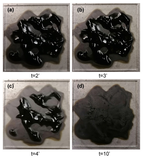 The preparation of the photomobile GOP (PM-GOP) follows a procedure in which a GO-suspension is deposited on a glass slide placed on a hot plate at 70 °C for ≈15 min. Figure 1 shows the GO-suspension at different times until the GO film is formed.
