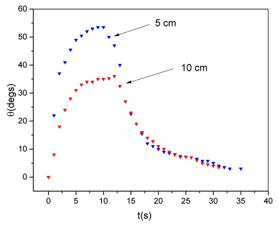 Angular displacement of the film as function of time when incoherent NIR illumination is used. Measurements are taken at two different distances, 5 (blue triangles) and 10 cm (red triangles) corresponding to 0.6 and 0.2 W/cm.
