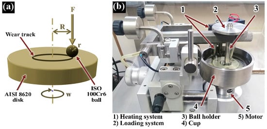The metallic system was ISO 100Cr6 steel balls 3 mm in diameter and AISI 8620 steel disks with a diameter and thickness of 25.4 mm and 5 mm, respectively. These materials were selected since both are one of the most employed steels for bearing applications due to their outstanding mechanical and tribological properties [13,15]. The balls were purchased from the Anton Paar supplier (Graz, Austria), while steel disks were manufactured and thermally treated by an external supplier.