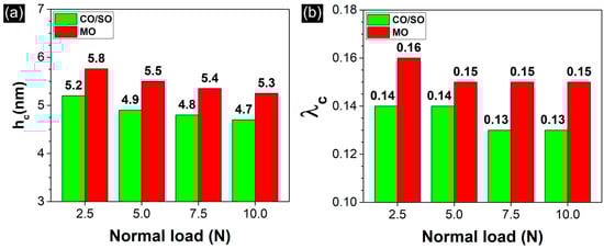The comparison in the estimated values of film thickness (hc) and lambda ratio (λ) for the 100Cr6/8620 metallic system lubricated with the CO/SO mixture and the mineral oil is shown in Figure 2. From values of lubricant film thickness (Figure 2a), it is possible to observe that regardless of the lubricant, at a temperature of 70 °C, the thickness of the lubricant film does not exceed 6 nm and decreases with the increase of normal load. The lubricant film obtained with CO/SO mixture has a thickness of around 10% less than that of the mineral oil in all cases. Because of the lubricant film thickness between the steel counterparts, the λ parameter shown in Figure 2b was between 0.13 and 0.16 and can be associated with the boundary lubricating condition. As mentioned above, this lubricating regime implies that there will be permanent contact between the counterparts throughout the duration of the tribological tests.