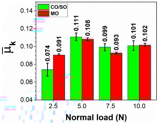 The behavior of the kinetic friction coefficient of the 100Cr6/8620 metallic system lubricated with CO/SO and mineral oil is shown in Figure 3. The graph in Figure 3 shows that both lubricants exhibited similar behavior with respect to the normal load. It can be also observed that at 2.5 N of normal load, the CO/SO binary mixture offered the best protection against friction, being a friction coefficient 19% lower than the obtained with the mineral oil at the same load. Nevertheless, at higher loads, the friction coefficient achieved with the CO/SO mixture was slightly higher than the mineral oil, 3% and 6% at 5 N and 7.5 N, respectively. However, at 10 N, the difference was insignificant (around 1%). This means that the CO/SO mixture offers a better response to friction at 2.5 N than the mineral oil and slightly similar behavior between 5 and 10 N. The normal load of 5N represents an important point for both lubricants. At this load, the two lubricants presented the highest friction values, and from it, the friction coefficient exhibited a tendency to decrease. This could be due to the fact that this load generates the conditions to prevent the creation of protective films.