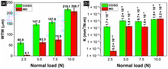 Figure 4, Figure 5 and Figure 6 show the wear parameters to evaluate the wear response of the 100Cr6 steel disks lubricated with CO/SO and mineral oil. From the results in Figure 4, it can be observed that both lubricants exhibited an increasing trend in wear with increasing load. It was found that there is a marked difference in wear between the systems lubricated with mineral oil and the CO/SO mixture at 2.5 N. At this load, the wear track width (WTW) obtained with the mineral oil was 90% lower than the obtained with the CO/SO mixture, while the wear rate was four orders of magnitude lower. However, by increasing the normal load, the difference was continuously reduced, and the values became close so that at 10 N the wear track width under mineral oil lubrication was only 5% lower and the wear rate was at the same order of magnitude as the CO/SO mixture. As can be seen, the wear response observed with the CO/SO lubricants, with an exception at the 2.5 N load, was similar to that of the MO. The wear rate values were of the order of 10−6 and 10−7, which represent systems with good wear behavior [24].