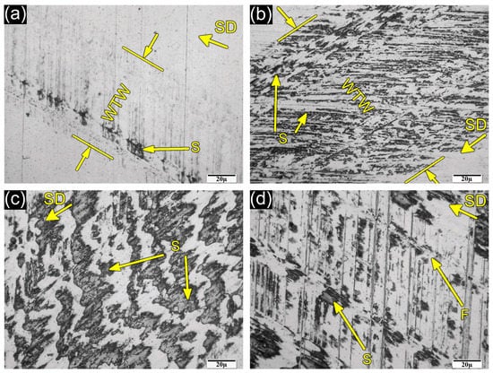 Optical micrographs of worn surfaces of AISI 8620 steel lubricated with CO/SO under (a) 2.5 N, (b) 5 N, (c) 7.5 N, and (d) 10 N, at 70 °C. Note: SD means sliding direction; S means spalling; and F means furrow.