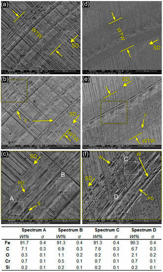 SEM micrographs of worn surfaces of AISI 8620 steel lubricated with (a–c) CO/SO mixture, and (d–f) mineral oil at 10 N and 70 °C. Notes: (c,f) are magnifications of the regions in yellow dashed boxes in (b,e), respectively; A–D dashed boxes are the regions of the EDS analyses; SD means sliding direction; S means spalling; F means furrow; PD means plastic deformation; and W means wedge wear.