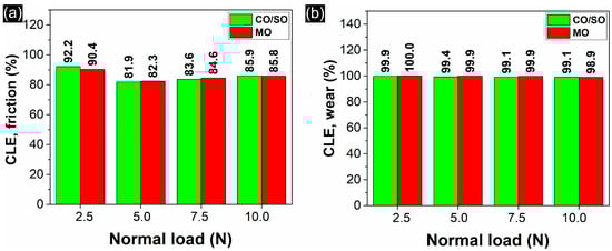Coefficient of lubricant efficiency (CLE) in terms of friction (a) and wear (b) for the CO/SO mixture and mineral oil at 70 °C.