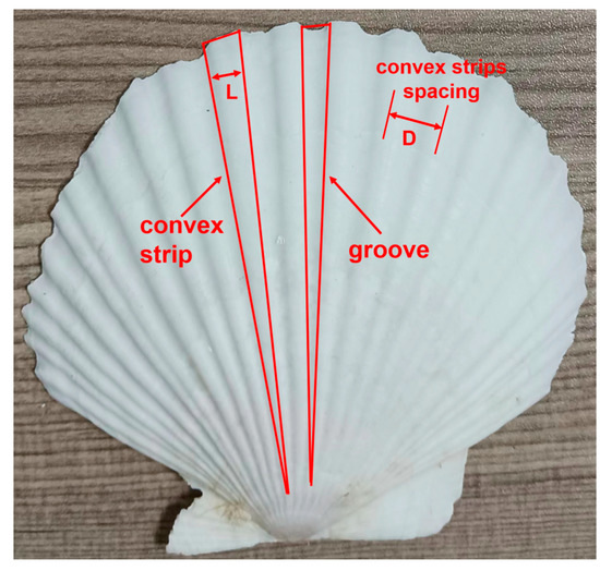 The shell is the coat shell of a mollusk that lives near the water. As a common aquatic organism, the mollusk’s shell has a regularly ordered surface texture that plays a unique role in reducing seawater abrasion. Its surface structure serves as an important reference for optimizing friction interfaces and is an ideal source of bionic inspiration [24]. Mollusks living near water are subjected to a large amount of frictional wear caused by collisions with other objects and impact wear caused by impact on water currents every day. In order to enhance the damage resistance strength of their shells, after a long period of evolution, mollusks gradually formed a convex prism-like body surface structure on the surface of their shells [25]. And there is a certain width of grooves between adjacent convex strips, separating the convex strips, as shown in Figure 1. (L is convex strips’ width and D is spacing between convex strips).