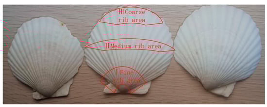Three shells were collected from the Jiao he River in Jilin Province, each of slightly different sizes. The width of the convex strips and spacing size between the convex strips of each shell showed a clear bottom-up increasing trend, which can be divided into three areas: fine rib area, medium rib area, and coarse rib area, as shown in Figure 2.