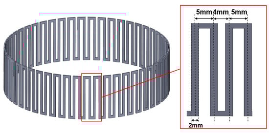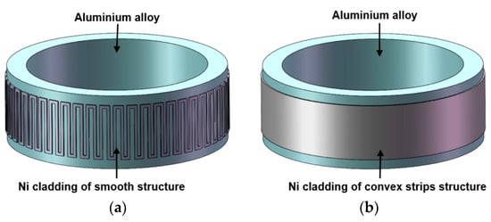 The measured ratio of the convex strips’ width to the spacing between convex strips was applied to the model design of the wear layer of the aluminum alloy drill pipe used in the actual geological core drilling. And the material of the convex strips’ structure was nickel (Ni) coating. The width of the convex strips is 2 mm, the spacing between convex strips is 4 mm and 5 mm, and the ratios of width and spacing are 0.5 and 0.4, respectively. The convex strips are arranged in parallel instead of the shell-shaped fan-shaped dispersion, which can effectively reduce the stress concentration phenomenon, as shown in Figure 4. A set of nickel coatings with a smooth structure was also designed as a control as shown in Figure 5.