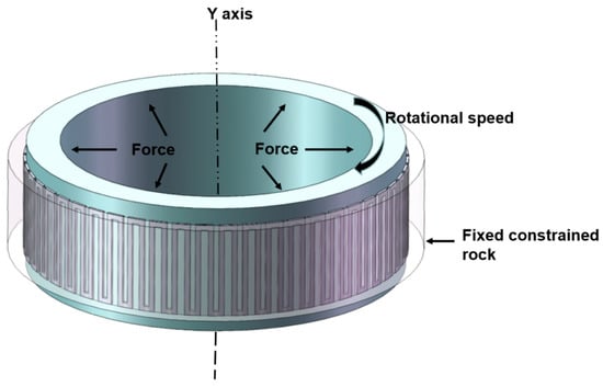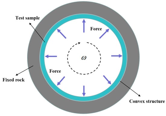 The model parameters of the drill pipe were defined as having an outer diameter of 146 mm, a wall thickness of 13 mm, a nickel coating thickness of 1 mm, and a counter-ground granite rock sample thickness of 6 mm. The drill pipe was set to only rotate around the Y axis, with a load of 100 N applied to its inner wall. This limits all conditions of movement of the rock and imposes fixed constraints on it, as shown in Figure 6. The numerical simulation time was 0.1 s which was sufficient to see the comparison of stress distribution and wear amount of the two structures. The drill pipe rotation speed was 30 rpm. The material parameters for each component are listed in Table 2 [26,27,28].