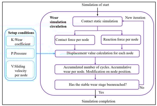 The wear simulation method workflow is depicted in Figure 7. It comprises two loops: condition setting and wear simulation. Prior to initiating the simulation, the setting conditions in the blue box need to be defined, which include pressure, velocity, and friction coefficient. As the simulation aims to compare two structures, the friction coefficient remains constant. In each iteration of the wear simulation loop, the contact nodes are repositioned, and nodal pressures, nodal velocities, and the relative displacements of each node along X, Y, and Z are computed. This is followed by the removal of material from the coated surface to represent wear. If the stable wear stage is reached, the iterative process stops [30]. Otherwise, it enters the next iterative cycle, as indicated in the purple process box.