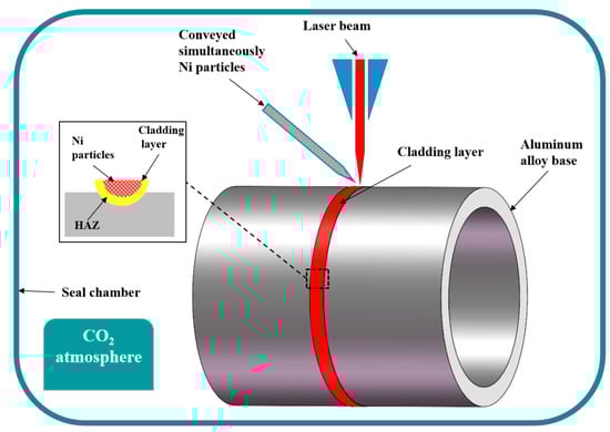 The nickel powder underwent vacuum-drying at a temperature of 150 °C for a duration of 2 h before the commencement of the test. The laser-cladding process was carried out using a CO2 multifunctional CNC laser processing equipment with a flux of 15 L/min and a purity exceeding 99.9%. This equipment was composed of a fiber laser, a control system, and a cooling system. The laser model was JNM-1GY-300B Nd:YAG. Its output power was 300 W and scanning speed is 30 mm/min. The laser wavelength was 1064 nm and laser beam was Gaussian laser beam with divergence of less than 5 mrad. The cladding thickness of the two structures was 1 mm, and the cladding was relatively uniform. To coat the drill pipe with a layer of nickel cladding, the alloy surface was first ground with a grinding wheel to remove the oxide layer, then cleaned with acetone, and finally coated with a layer of light-absorbing material. Local heating of the aluminum alloy pipe’s surface was carried out using a laser until it melted, and prefabricated nickel powder was quickly sprayed in front of the laser beam using a synchronous powder-feeding method. Once the beam was removed, the aluminum alloy cooled and solidified, forming a metallurgically bonded cladding layer on the outer layer of the aluminum alloy tube. By controlling the laser’s path, cladding layers of varying designs could be formed on the surface of the aluminum alloy drill pipe. The cladding principle is shown in Figure 8.