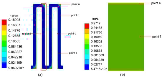 Figure 11 shows stress cloud images depicting the contact surface between the two structures and the rock. In Figure 11, it can be observed that the stress distributions of the cladding layers of the two structures at 0.1 s exhibit distinct characteristics. The stress distribution of the smooth cladding layer appears to be relatively uniform with no stress concentration phenomenon. The stress in the middle area is found to be smaller compared with the upper and lower edges. This is due to the fact that the edge area serves as the boundary of the cladding layer, leading to stress concentration when it makes contact with the rock. On the other hand, the stress of each convex strip in the cladding layer of the convex strip structure appears to be highly similar. Specifically, the edge stress on the side facing the rotation direction is greater than the edge stress on the back side, and both are greater than the stress in the middle area. Moreover, the stress on the upper and lower edges is greater as compared with the stress in the middle area. More significant stress concentrations were observed at the ends of the upper and lower edges facing the direction of rotation. In addition, six stress measuring points a, b, c, d, e and f were selected in the stress cloud images of the two structures.