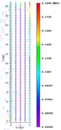 In order to further explore the stress distribution characteristics, the stress on each node in a convex strip region1 in Figure 11a is extracted, which is 37 mm long and 2 mm wide. Its bottom left end is used as the origin of the coordinates and the forward direction of rotation and vertical upward direction are, respectively, the positive direction of the X and Y axes. The position–stress scatter diagram is drawn as shown in Figure 12. The stress magnitudes of six points a, b, c, d, e, and f were also extracted and made into Table 4.
