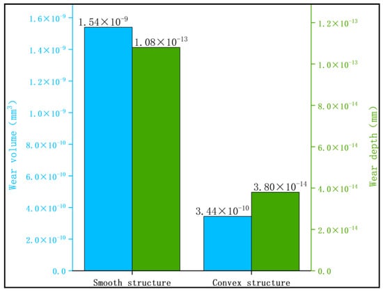 Table 5 presents the simulation results for the wear amount of the cladding layer after rotating for 0.1 s. Figure 13 displays the comparison of wear amounts between the two structures, where the blue column graph shows that the cladding layer with a convex strip structure has 77.6% less wear than the cladding layer with a smooth structure. In order to exclude the surface area change caused by the thickness change in the cladding layer, the amount of wear was divided by the external surface area of the model. The comparison of the wear depth of the two structures shown in the green bar graph in Figure 13 was obtained, which shows that the lifetime of the cladding layer of the convex strip structure is 64.8% higher than that of the smooth structure. This indicates that the design of the convex strip structure can effectively enhance the wear resistance and lifetime of the drill pipe.