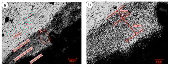 Figure 14 shows the morphology of the aluminum alloy substrate, the transition layer, and the cladding layer observed under metallographic microscope after corrosion with a keller reagent. The microstructure of the transition layer between the cladding layer and the aluminum alloy matrix was observed and analyzed using a scanning electron microscope with a larger magnification.