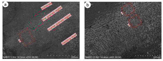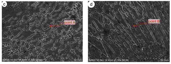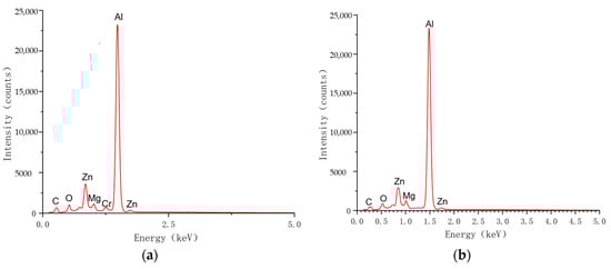 Figure 15 shows a scanning electron micrograph of the aluminum alloy substrate transition layer and cladding layer. It can be seen from the Figure that there are significant differences in grain size and morphology between the fine-grained region and the coarse-grained region. The fine-grained region has equiaxed grains with sizes ranging from 3 to 10 μm, while the coarse-grained region has columnar grains with sizes ranging from 10 to 30 μm. Point A of the fine-grained region and point B of the coarse-grained region were selected for EDS spectroscopy to determine the composition of the coarse- and fine-grained regions. As shown in Figure 16, it can be seen that the composition of both points are aluminum and some impurities, which indicates that the cause of the coarse- and fine-grained regions is recrystallization and grain growth during the condensation of Al melting. The difference in grain size and morphological characteristics between the fine- and coarse-grained region is due to the fact that the fine crystalline zone produced by laser cladding is in contact with the aluminum alloy matrix, which is less affected by the heating of the laser and with the release of stored energy in the original grains; new equiaxed grains without distortion are formed and grow, thus forming recrystallized grains. The coarse crystalline zone produced by laser cladding is closer to the cladding layer and is more affected by the heating, and the grains undergo the process of recrystallization and grain growth to form columnar crystals [31].