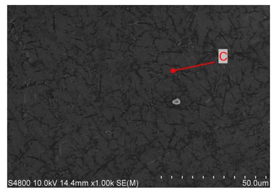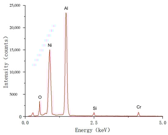 Figure 17 shows the morphology of the cladding layer observed under the scanning electron microscope. It can be seen that the cladding layer is a uniformly distributed cast equiaxed crystal organization without the presence of Ni powder particles, and there are small interstices within the cladding layer. The EDS spectral analysis of the selected C point on the cladding layer is shown in Figure 18, which shows that the main composition of the cladding layer is AlxNiy phase. Because the laser cladding is carried out in a CO2 environment, there will be components such as C, O, etc. Because the impurities are entrapped in the nickel powder, there are components such as Si, Cr, etc.