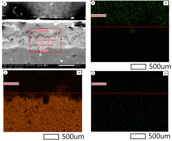 In order to better display the phase composition of each region, EDS mapping analysis was performed for the areas selected by the red boxes, as shown in Figure 19a. Figure 19b reflects element Ni enrichment, Figure 19c reflects element Al enrichment, and Figure 19d reflects element Zn enrichment. In the coarse-grained region, the fine-grained region, and the substrate, the main element is Al, and other elements are relatively few. The percentage of Al is large in these regions. Therefore, in the map, the brightness of Al in these regions is extremely bright. In the cladding layer, there are two main elements: Ni and Al. Therefore, the percentage of Al in this area is lower than in other brighter areas. Moreover, the brightness of the Al in the cladding layer contrasts with other areas where the Al is brighter, so it does not look obvious. But, the fact is that in the cladding layer, the elements Al and Ni are present at the same time. In areas outside the cladding layer, Ni hardly appears and Zn is enriched.