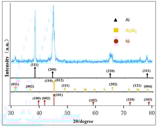 The composition of the cladding layer was derived from the EDS analysis of the cladding layer, and XRD analysis was performed to further investigate the specific products. Figure 20 shows the results of XRD analysis, and it can be concluded that the cladding layer mainly consists of Al3Ni2 and Al phase. The melting point of Ni is much higher than that of Al, and during the laser melting process, Al will melt in advance, and some of it will react with Ni to form Al3Ni2. In addition, Figure 20 shows that the diffraction peak of Ni does not correspond to that of the cladding layer, and there is no ferromagnetism on the surface of the molten layer, indicating that the Ni powder is no longer present and reacts with Al to form Al3Ni2. Both the Al alloy matrix and the Ni powder were dissolved during the laser heating and cladding process. The chemical reaction during the melting process is as follows: 3Al+ 2Ni → Al3Ni2 [32,33].