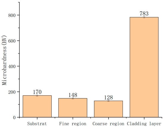 The reason why the drill pipe after laser cladding has better wear resistance is that Al3Ni2 produced in the melting process is an intermetallic compound with high hardness and wear resistance [34,35].The microhardness of the aluminum alloy matrix, fine-grained regions, coarse-grained regions, and cladding layer were tested in turn, and the results are shown in Figure 21. The hardness of the aluminum alloy matrix is 170 HV, and the hardness of the coarse- and fine-grained regions are 128 HV and 148 HV, respectively, which are 24.7% and 12.9% lower than the hardness of the matrix. The surface hardness of the cladding layer can reach 783 HV, which is 4.6 times the hardness of the substrate. When the drill pipe rotates and wears against the rock, the outer high-hardness Al3Ni2 as the hard phase has excellent resistance to deformation to reduce the wear. The transition layer and the aluminum alloy matrix as the soft phase can buffer the shear stress generated during the experiment.