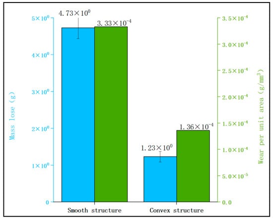 The test results for the cladding layer of the bionic convex strips and smooth structures are shown in Table 6. The comparative results for the frictional wear quality of the two structures are shown in the blue bar graph in Figure 22. The blue bar graph shows that the wear quality of the cladding layer of the convex strip structure is reduced by 74.0% compared with that of the smooth structure. If ignoring the change in surface area due to the change in thickness of the cladding layer, the results of the comparison between the wear per unit areas of the two structures are shown in the green bar graph in Figure 22. The green bar graph shows that the lifetime of the convex strip structure is improved by 60% compared with the smooth structure. The experimental test results are close to the simulation results, indicating that the design of the convex strip structure can effectively improve the life of the drill pipe.