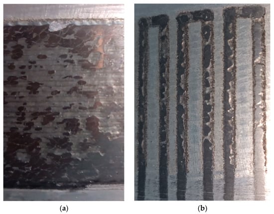 Surface morphology of the test block after the test (a) smooth structure, (b) convex strip structure.