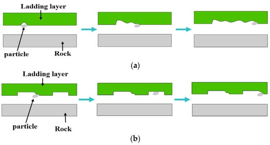 The stress analysis in Figure 12 reveals that stress is concentrated mainly on the upper and lower edges and the left and right edges of the convex strip, with relatively small stress in the middle area. The stress peak value is 4–5 times higher than the stress valley value. The stress distribution of the four points selected on the convex strip structure cladding layer shows that the stress at point a is the highest, which is four times that of point d. It indicates that stress concentration occurs at the end of the upper and lower edges facing the direction of rotation during the friction and wear process with the rock. Furthermore, the stress at point b is greater than that at point c, indicating that the edge on the side facing the direction of rotation generates greater stress on the same convex strip. The stress at point d is the smallest, indicating that the non-edge region of the convex strip structure cladding layer produces the least stress. The stress distribution of the two selected points on the smooth structure cladding layer is e > f, indicating that the stress generated on the upper and lower edges is greater than that in the middle area. In addition, the stress points e, a, and f are much larger than the stresses at points b, c, and d. This indicates that the stresses in the smooth structure are larger than the stresses in the convex structure, except for point a and the area similar to point a. The macroscopic expression is that the wear of the molten layer of the smooth structure is larger than that of the molten layer of the convex structure. The cause of this phenomenon is that during the rotation process, both Ni and Al alloys are in the elastic deformation stage, but the difference in elastic modulus between them is large, so the deformation variables will be different. Due to the continuous coating, the stresses in the smooth structure cannot be released and then stored in the coating. The convex strip structure breaks the continuous surface with grooves separating the convex strips, allowing space for stress to be released.