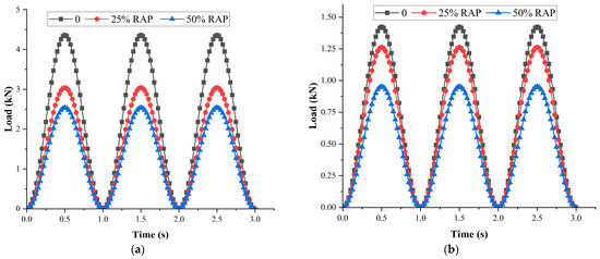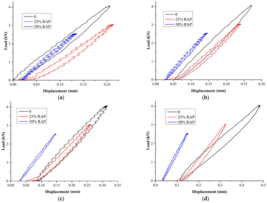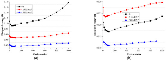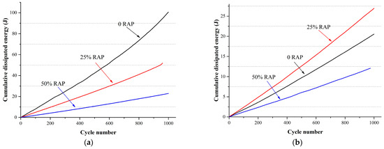 - At −10 °C, the incorporation of RAP significantly reduced the dissipated energy and the cumulative energy, indicating the fatigue cracking resistance was weakened. At 25 °C, HMA with 25% RAP presented the superior fatigue-cracking resistance in terms of the cumulative dissipated energy. The developments of the dissipated energy and the cumulative energy were consistent with the fatigue life results, determined as the cycle number at the end of the OT test, indicating fatigue life determined by the 50% stiffness reduction method may be not appropriate for fatigue characterization under the constant load-controlled mode.